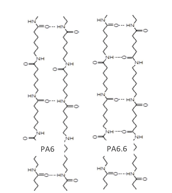 PA6由己內(nèi)酰胺開環(huán)再聚合,PA66由己二胺和己二酸聚合而成。二者分子鏈中都含有如下的酰胺基團結構: