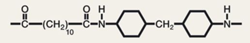 常見的透明尼龍種類有 PA MACM12、PA 12/MACMI、PA 6I/X 等等。由于環(huán)狀結(jié)構(gòu)或側(cè)鏈結(jié)構(gòu)的單體選擇較多,因此幾乎每個牌號的透明尼龍組成都不盡相同,這里舉兩個品種進行說明。