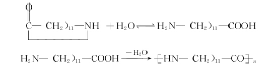 月桂內(nèi)酰胺在鹽酸、硫酸、硼酸或己二酸等酸催化劑存在下,進行水解開環(huán),生成00-氨基十二酸,再經(jīng)縮聚得尼龍12。反應式如下: