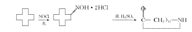 2)光亞硝化法以環(huán)十二烷為原料,在高壓汞燈的照射下,使環(huán)十二烷和氯化亞硝酰反應,得到環(huán)十二酮肟鹽酸鹽,再用濃硫酸經(jīng)貝克曼分子重排,得到月桂內(nèi)酰胺。反應式如下: